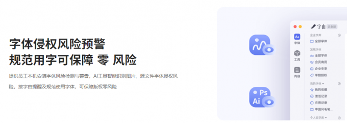为了实现用字的零风险,字由还提供了本机字体风险检测、Ai智能识别字体等安全预警功能。企业可为员工配置相关的功能,确保员工在设计作品中使用已授权的字体,时刻做到用字规范不侵权。